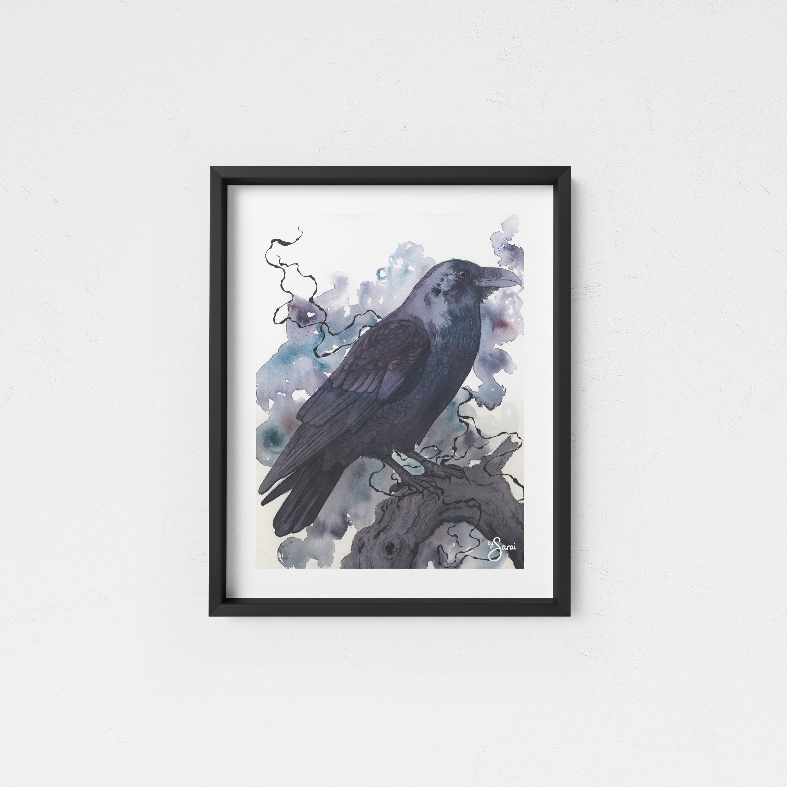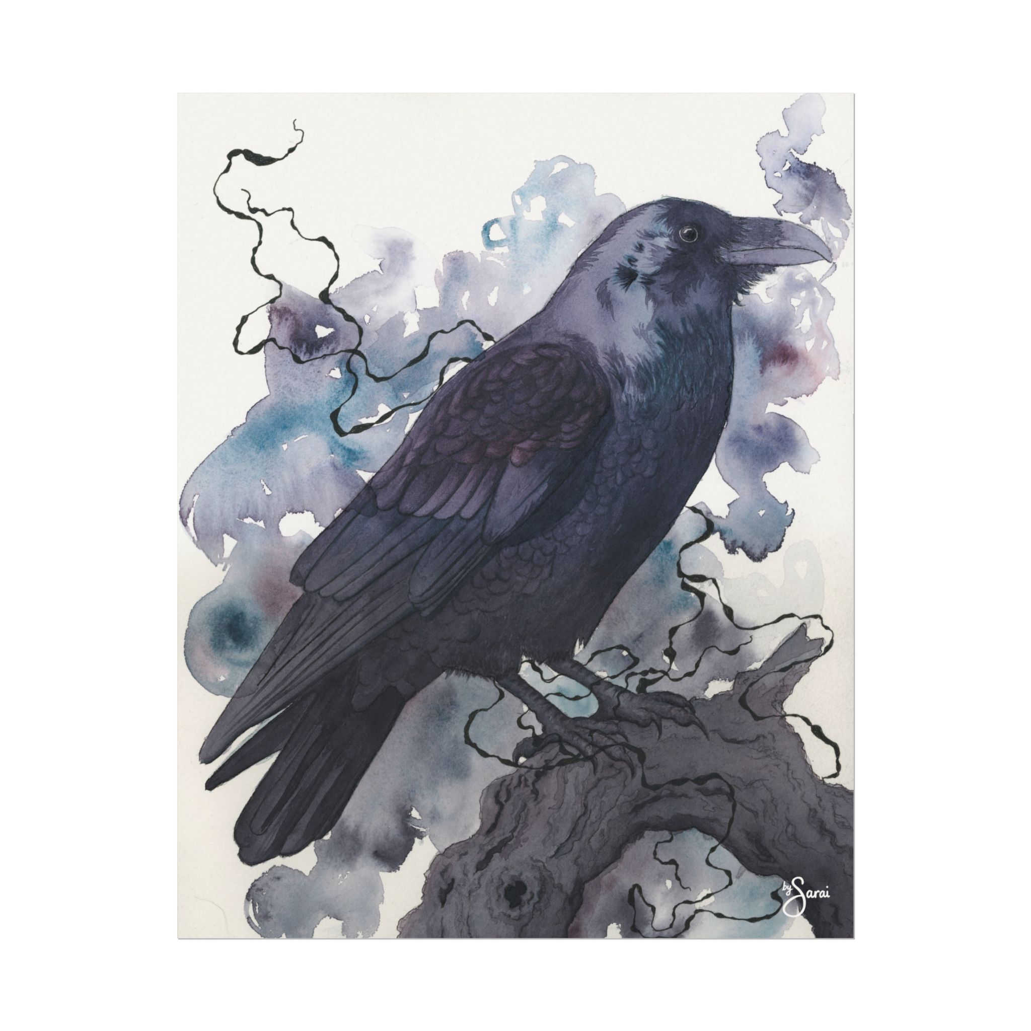 There’s a quiet intelligence in the way this raven holds itself. Steady, watchful, completely at home in the shadows. The soft washes behind it feel like mist or memory, blurring the edges just enough to make everything a little mysterious. It’s about stillness with weight, about presence without noise, and the kind of dark that isn’t empty… just deep.